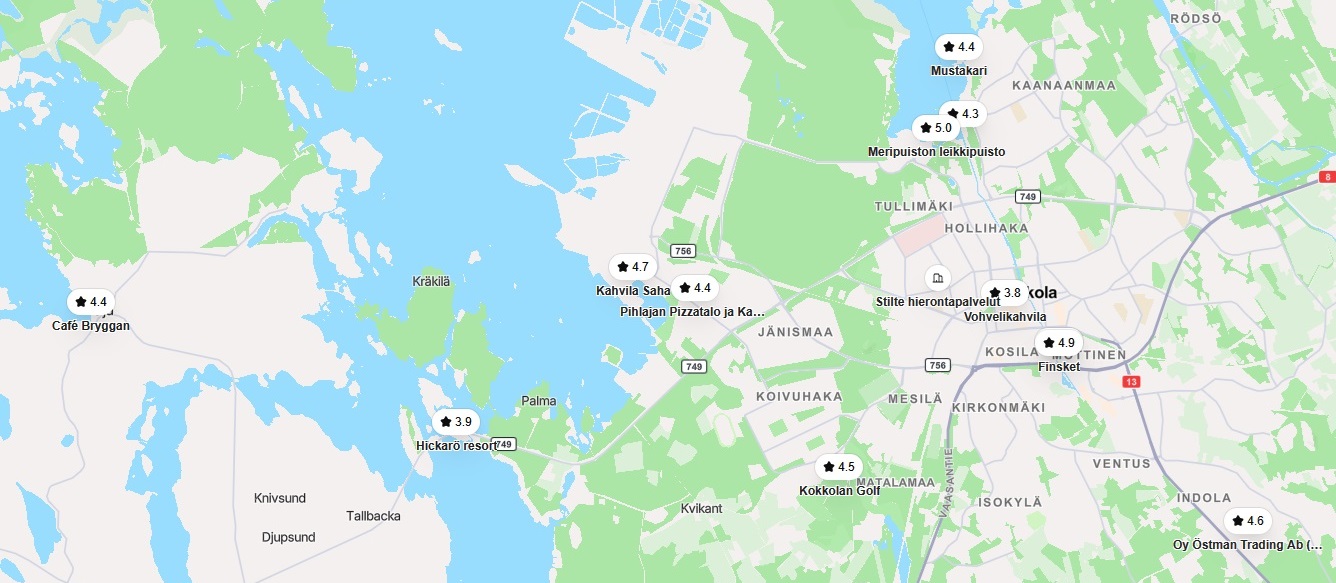 Kurkkaa reitin varrella esimerkiksi Cafe Bryggan ,Tyynelän tontut ja Köpmanholmen.